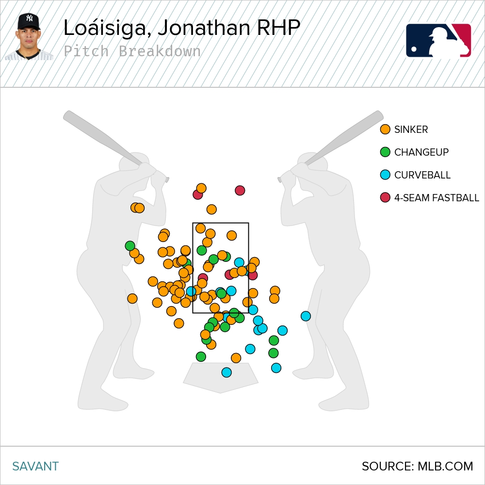 画像1枚目の通り、2024年シーズンはシンプルに高めのFFと足元へのSLで空振りを狙いに行っていたのですが、2枚目の通り、2025年シーズンはFFをゾーン下部に集め、さらにSLも同じスポット(高さ)に投げ込むという非常に特殊なアプローチを採用。